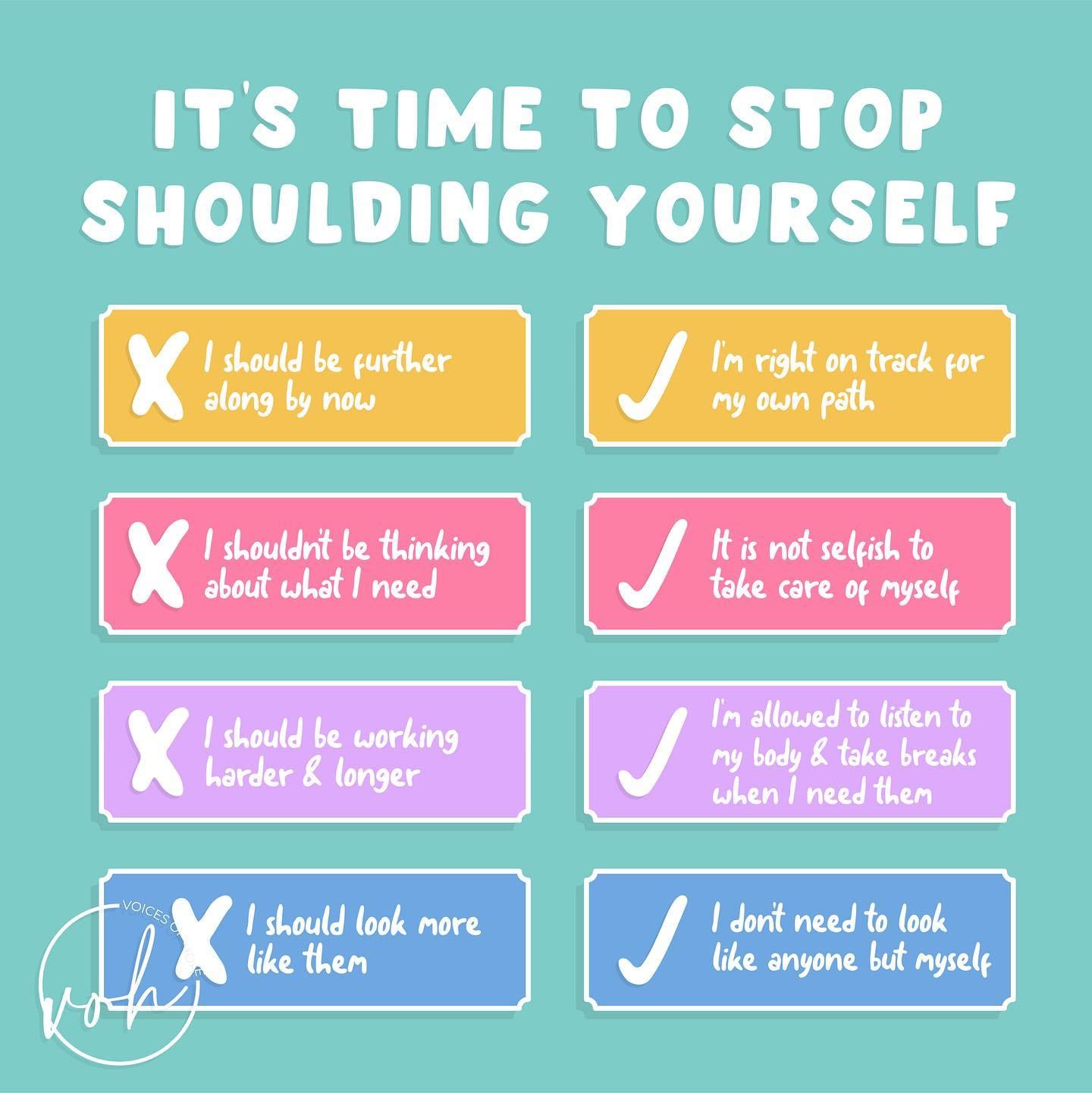 Comparison plays a huge part in the “shoulds” we put on ourselves. The truth is, each person has different capacity, different passions and values, varying resources available to them, and are in totally different emotional spaces. If someone else’s output is more prolific than mine, maybe a question would be what is the price they pay for what they are achieving? Every achievement represents a cost to self – it may totally and completely be worth it, or not. What is the price I am willing to pay to achieve something, and how do I keep my humanity at the core of that?