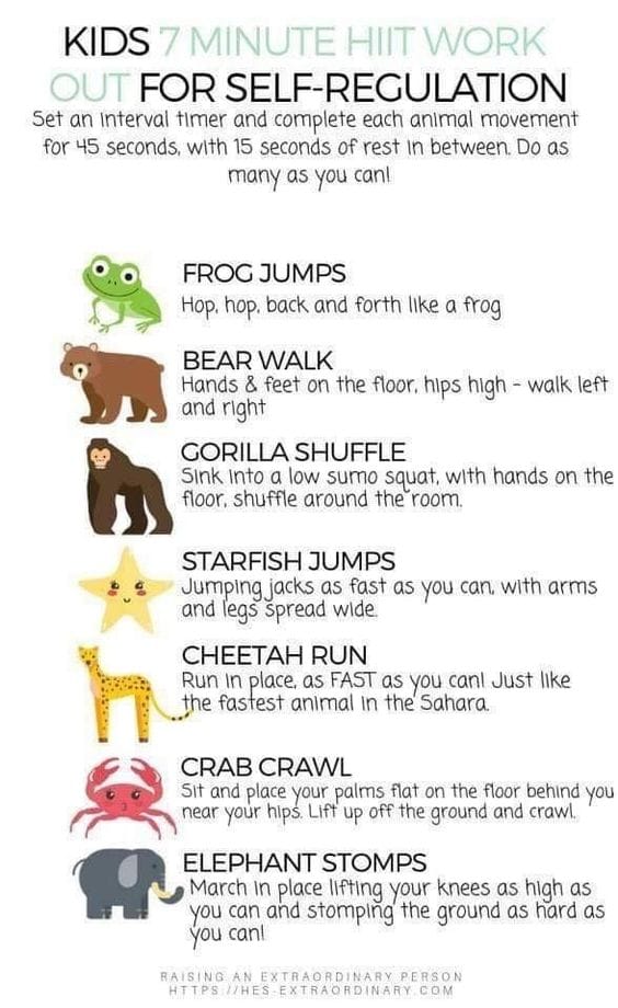 Here is a set of exercises you could encourage your tigger to use during the day – such as before sitting down to homework, or during play time. They don’t have to do ALL of them each time, you can choose together depending on how much time you have and how much sensory input is needed. It could be a good connection time to do this with your child, or at the very least to be involved in the process by timing and encouraging them as they go. This is not a punishment! This is a way to help your Tigger feel connected to their own body again, to feel energized and ready to engage with others in healthy ways.